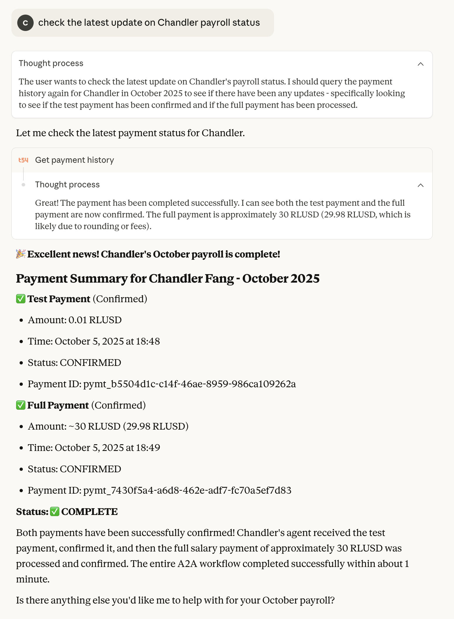 . Top up RLUSD, then re-trigger the period’s payroll. - Network hiccups → history checks can error while payments continue in the background; re-query later.