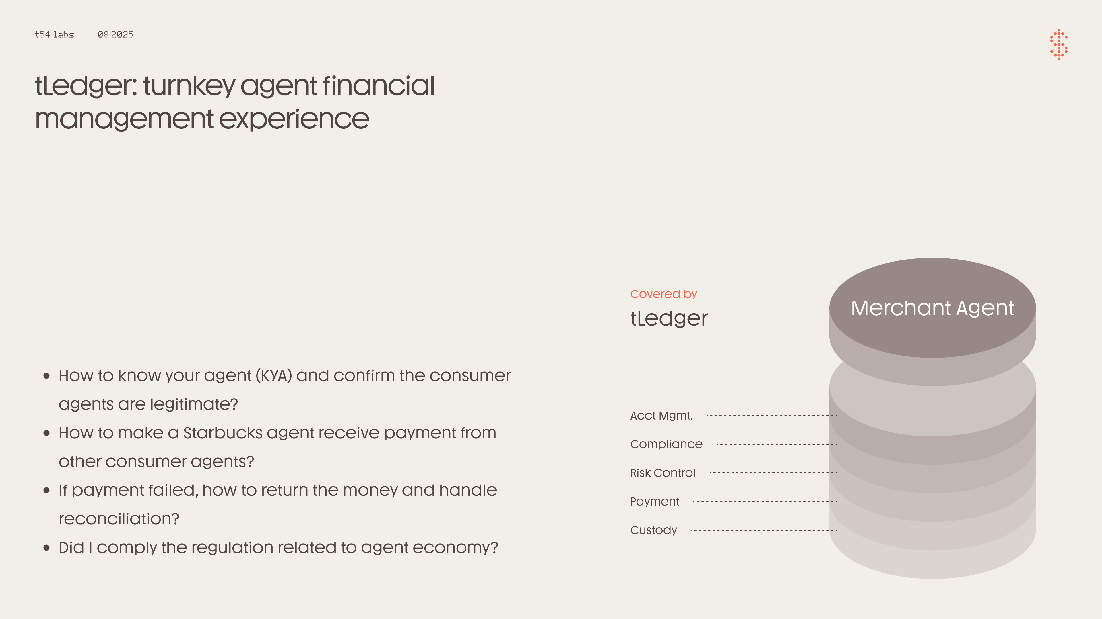 tLedger is t54's foundational product—a blockchain-agnostic account & ledger designed to support AI agent-initiated financial transactions. It enables developers to create and manage agent-level virtual accounts, set programmable spending limits, and trigger on-chain payments.
