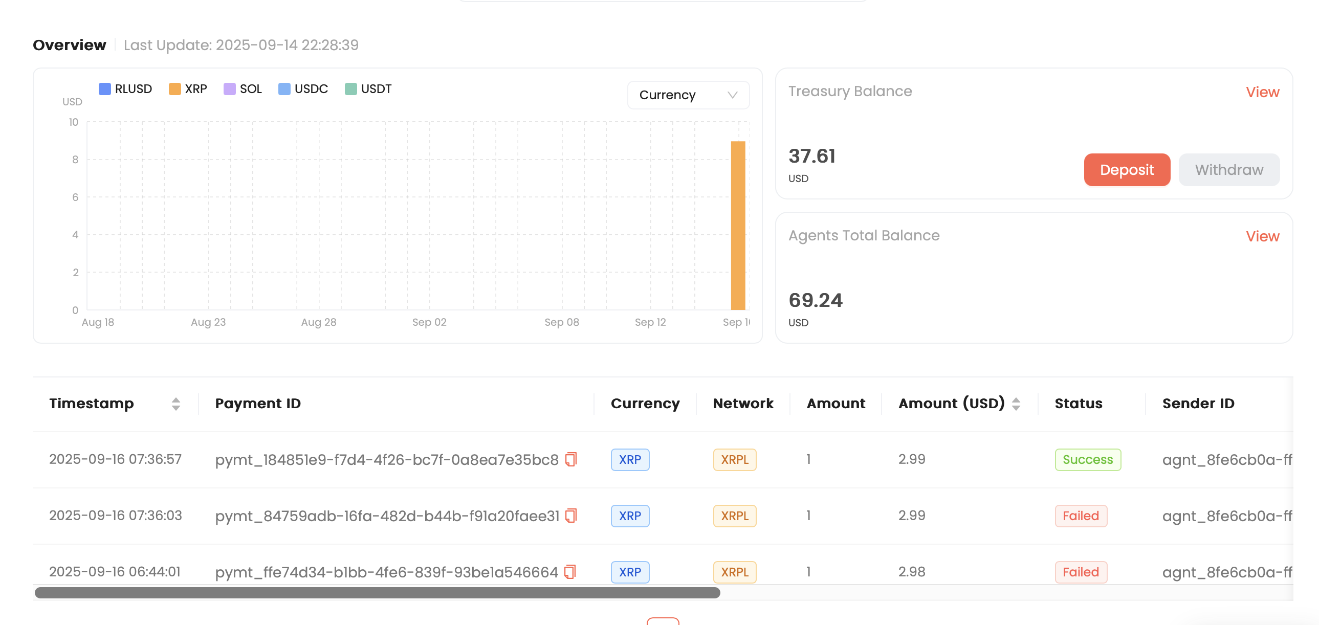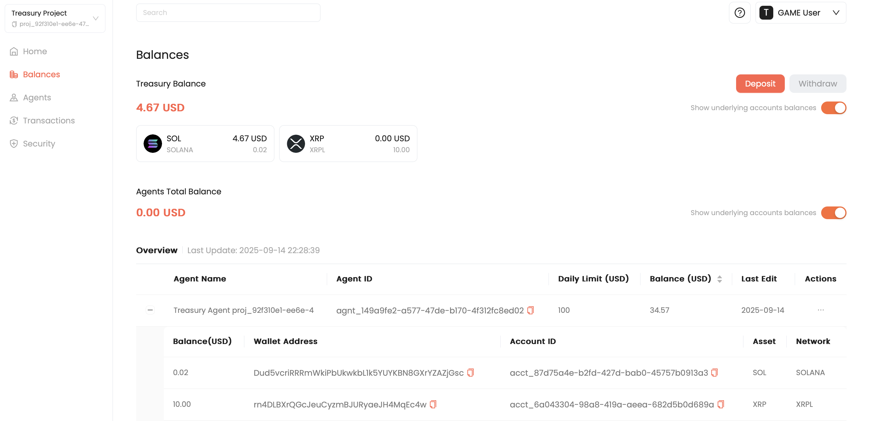 The Balances page provides a comprehensive view of all financial assets held within the treasury and by individual agents. It's designed to give users a clear, real-time snapshot of their cryptocurrency holdings and transaction history.