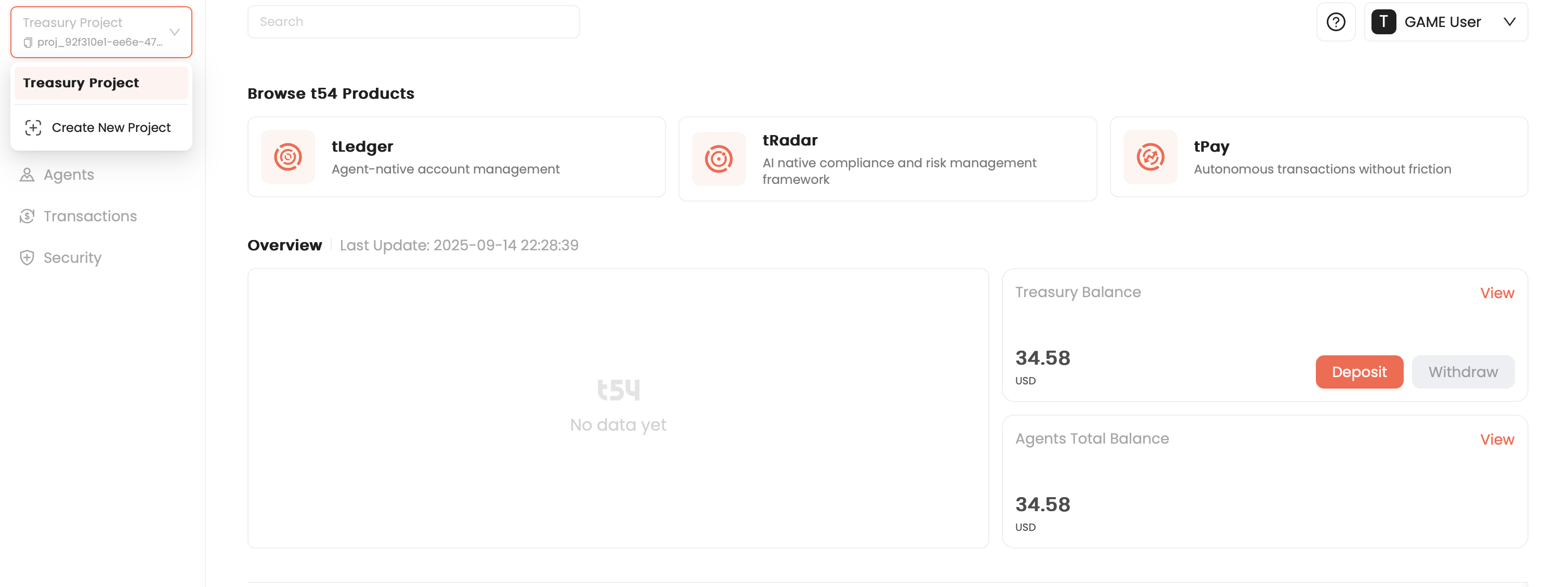 The top-left corner of the tPortal dashboard is your control center for managing projects. You can easily switch between existing projects or create a new one to organize your agent accounts.