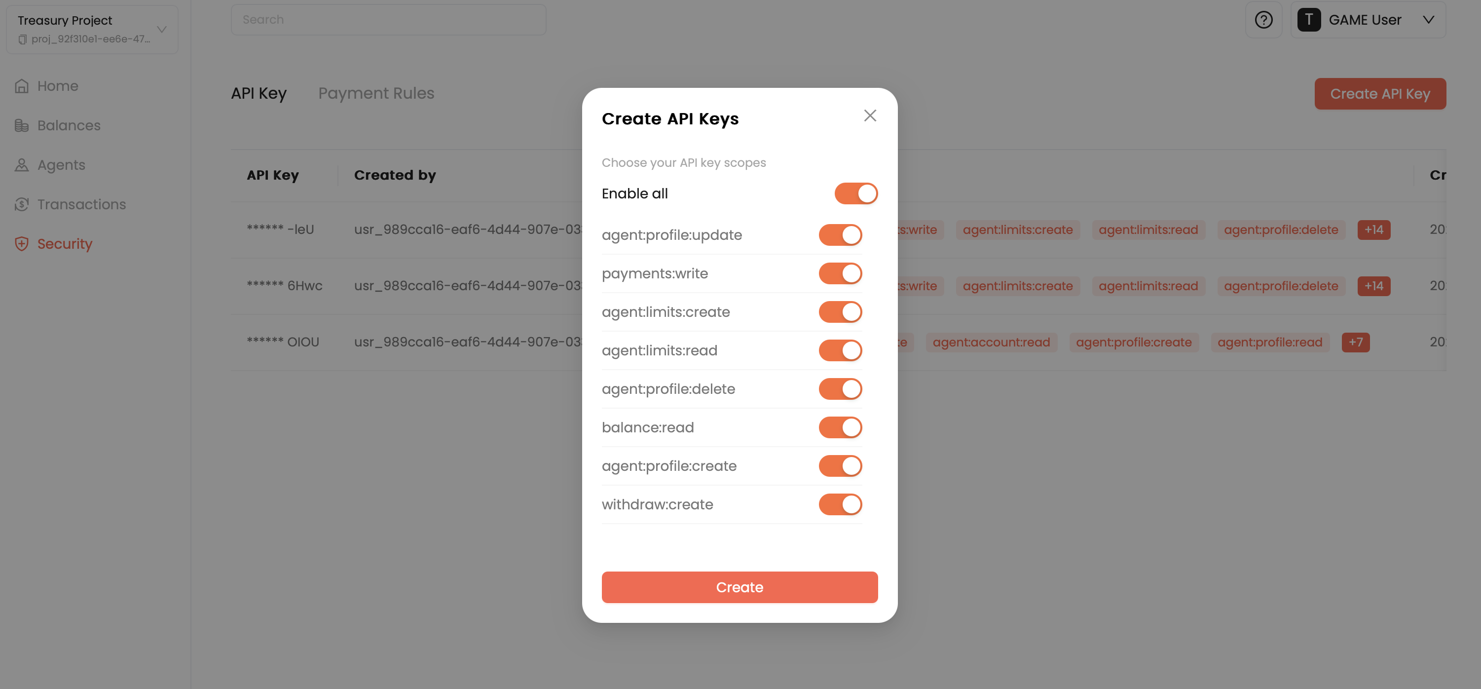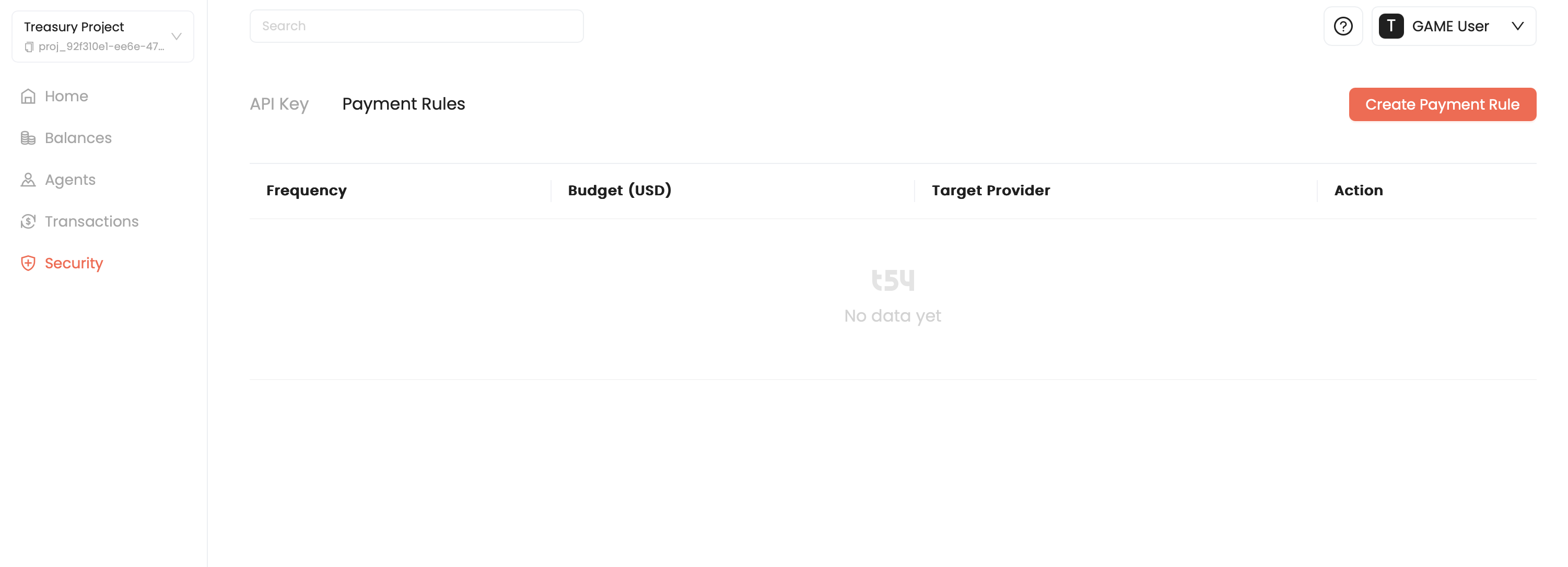 The Security page is the central hub for managing API keys and defining automated payment rules for the project.
